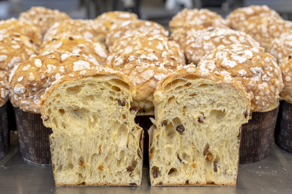 El panettone té les seves arrels a la Llombardia, on tradicionalment es fa amb massa mare, rovells d’ou, mantega i una fermentació llarga que pot durar dies. El resultat és una molla alveolada i humida, amb una cúpula perfecta i una textura lleugera que ha convertit aquest dolç en un símbol de celebració.