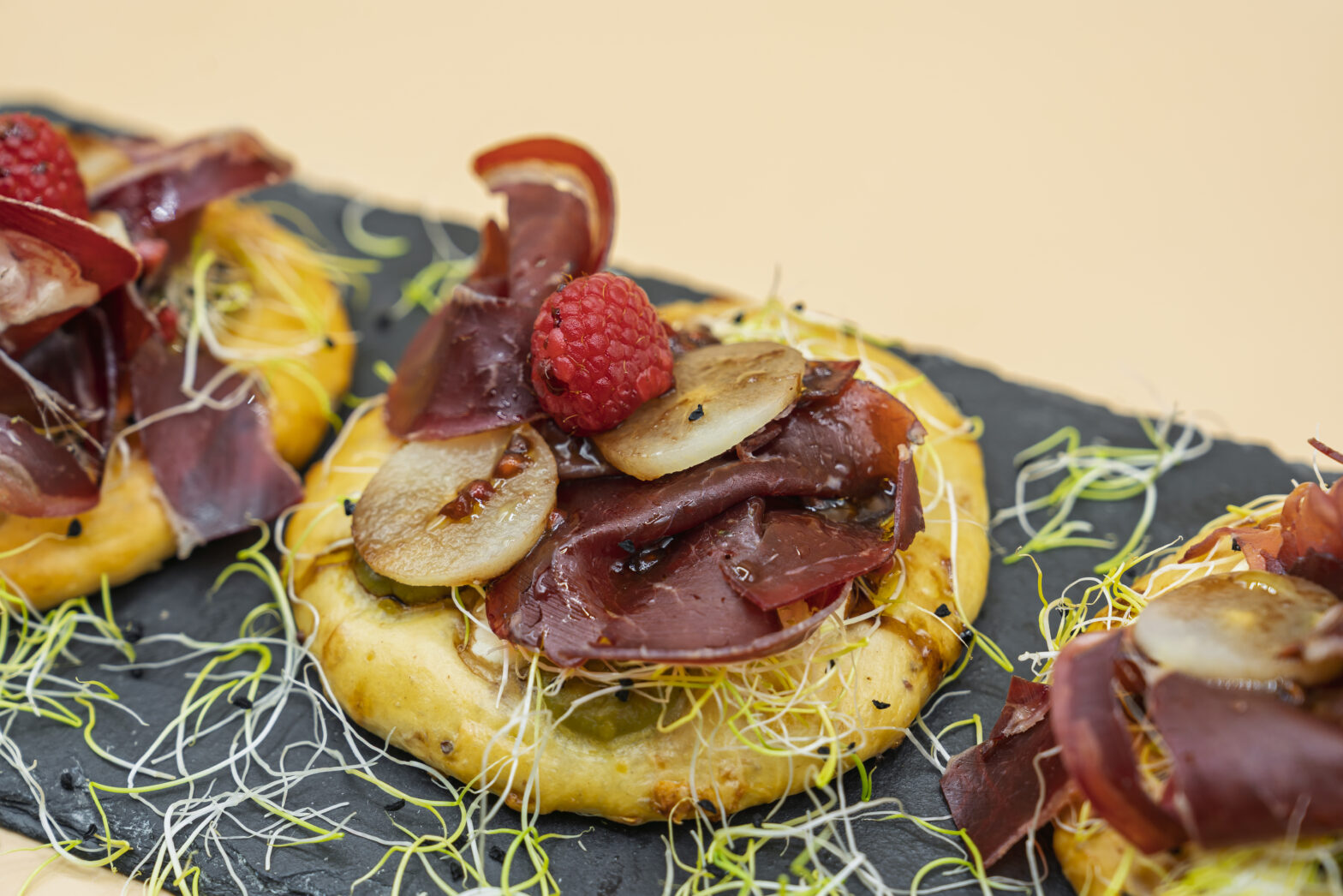 Coca de cecina, formatge de cabra i alvocat amb brioix de pesto i parmesà